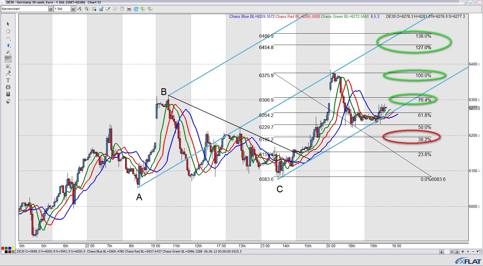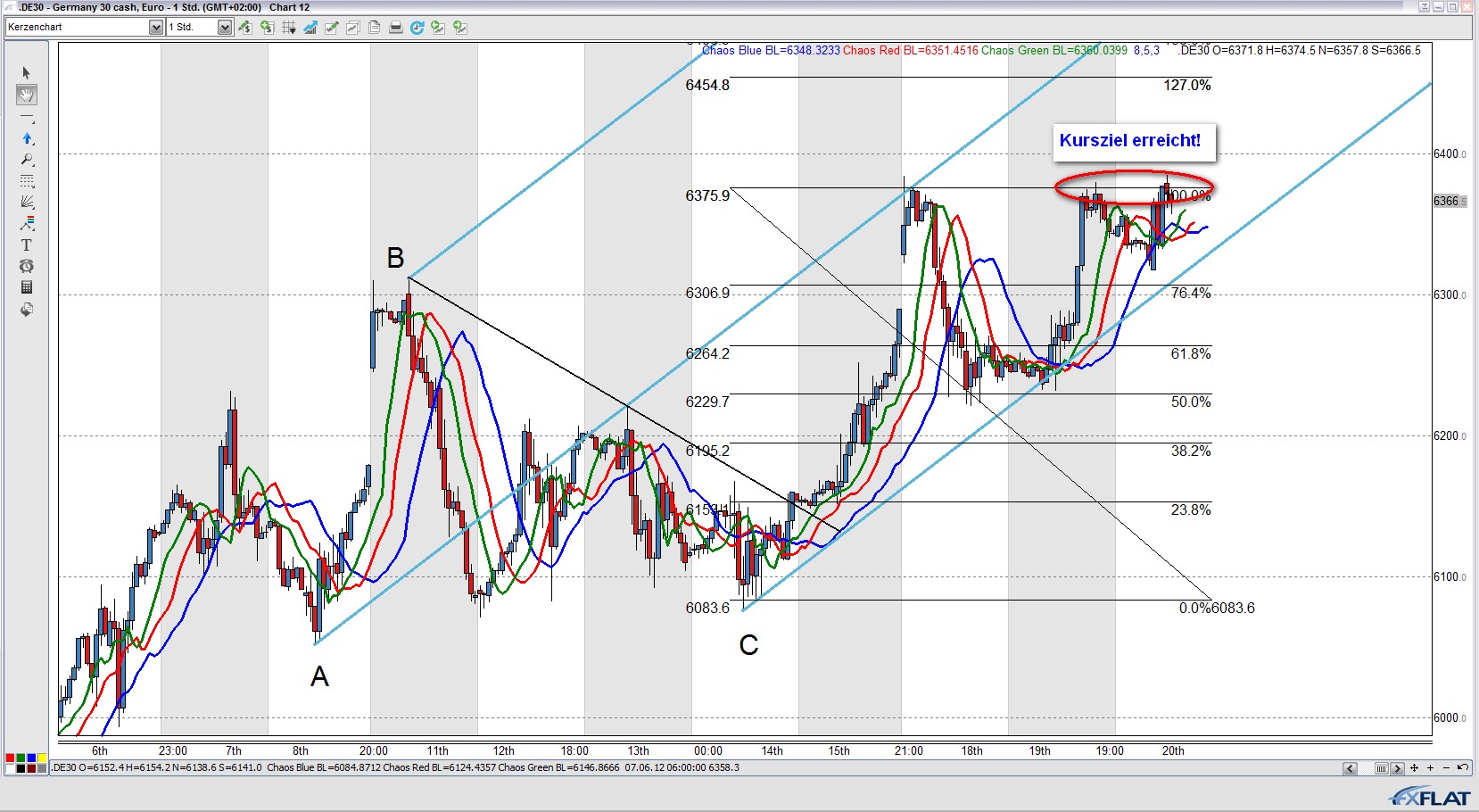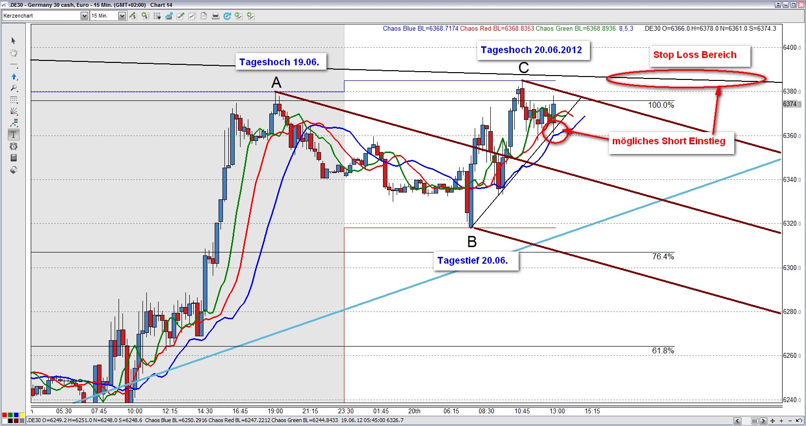 Bei Unterschreiten der Trigger Linie entsteht ein mögliches Short Signal. Voraussetzung dabei ist, dass der Kurs nicht noch oben aus dem Andrew´s Pitchfork ausbricht und neue Tageshochs markiert. Bei einem Short Entry platzieren wir einen Stop oberhalb des Punktes C, d.h. oberhalb des Tageshochs vom 20.06.2012.