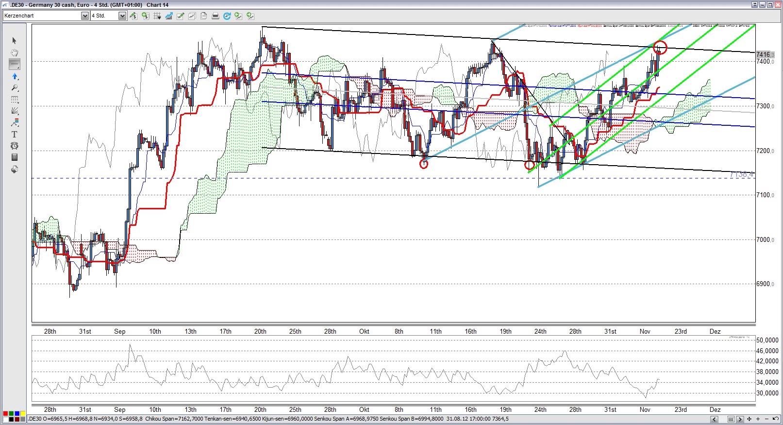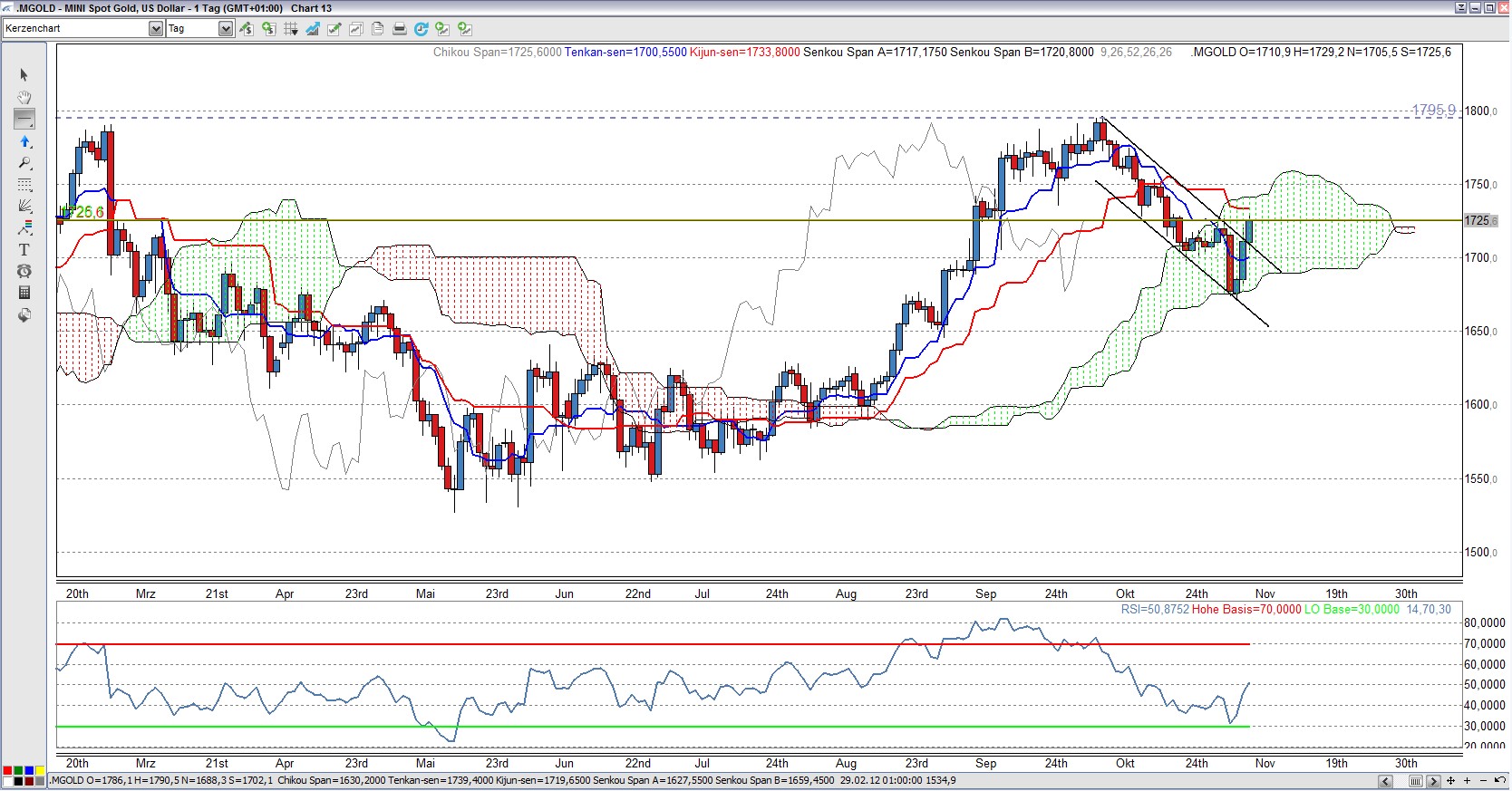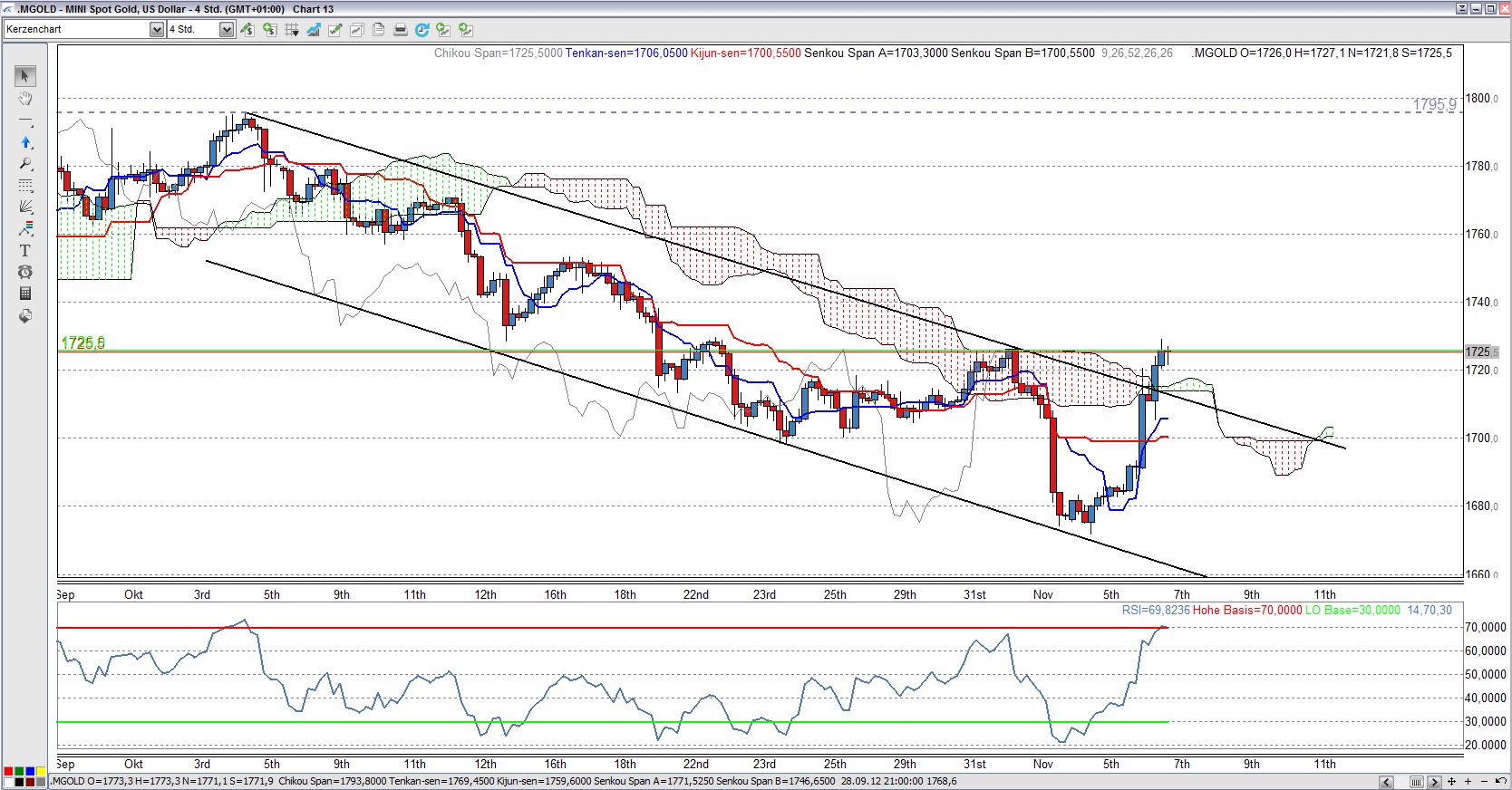 Hier ist schön zu sehen, dass sich der Kurs des Währungspaares EUR/USD immer noch im aufsteigenden AP befindet und fast punktgenau an der oberen AP Begrenzung abprallte. Solange der Kurs innerhalb des AP bleibt, ist der Aufwärtstrend intakt. Erstes Kursziel ist sicherlich die wichtige Marke von 1,30.
