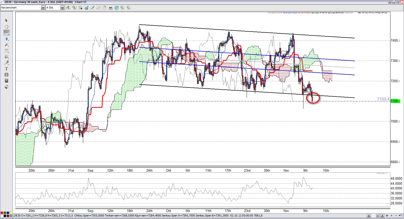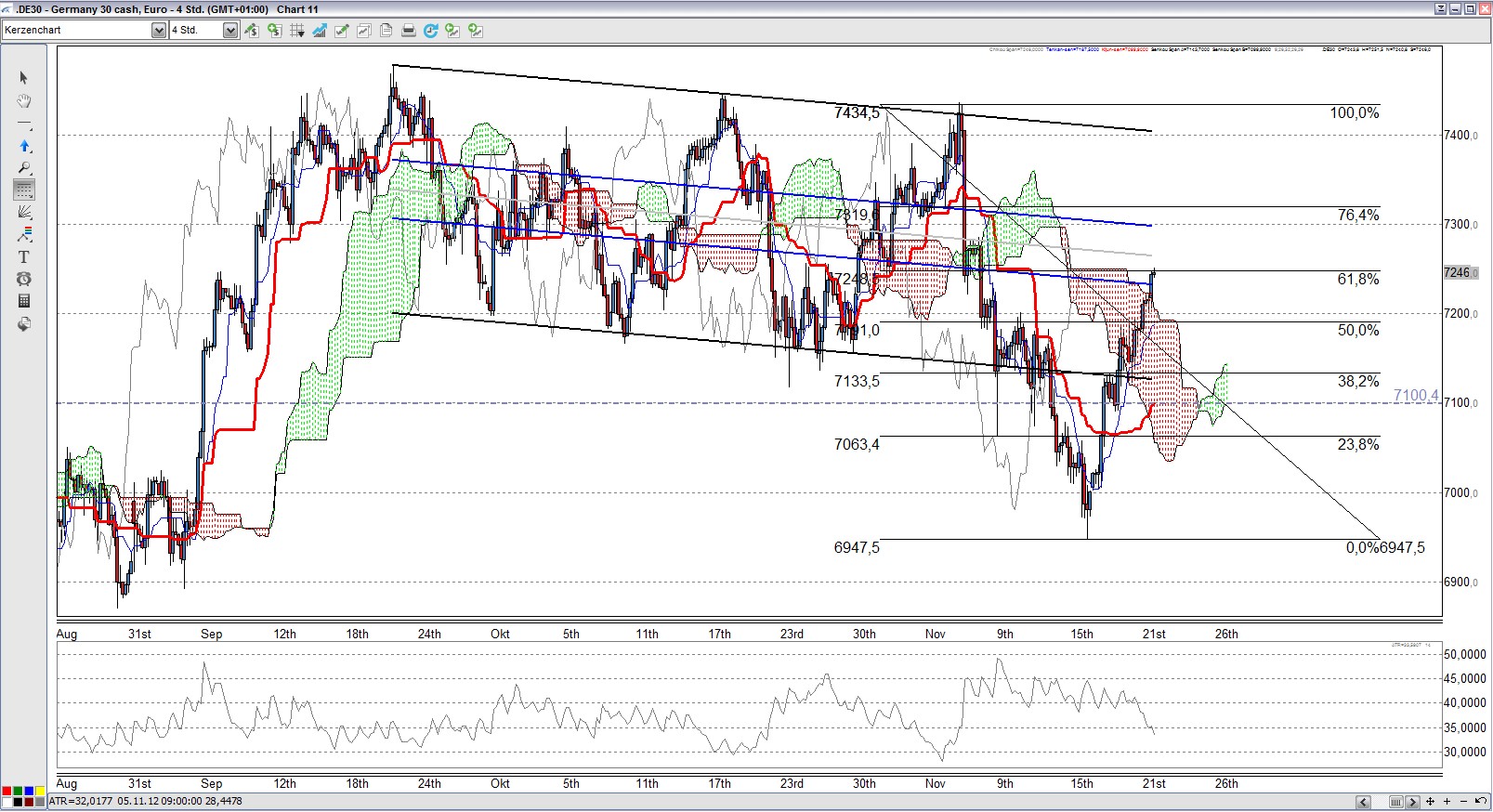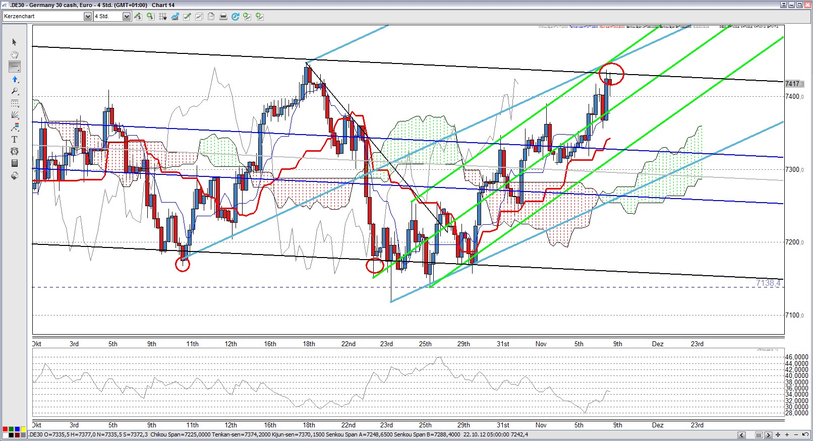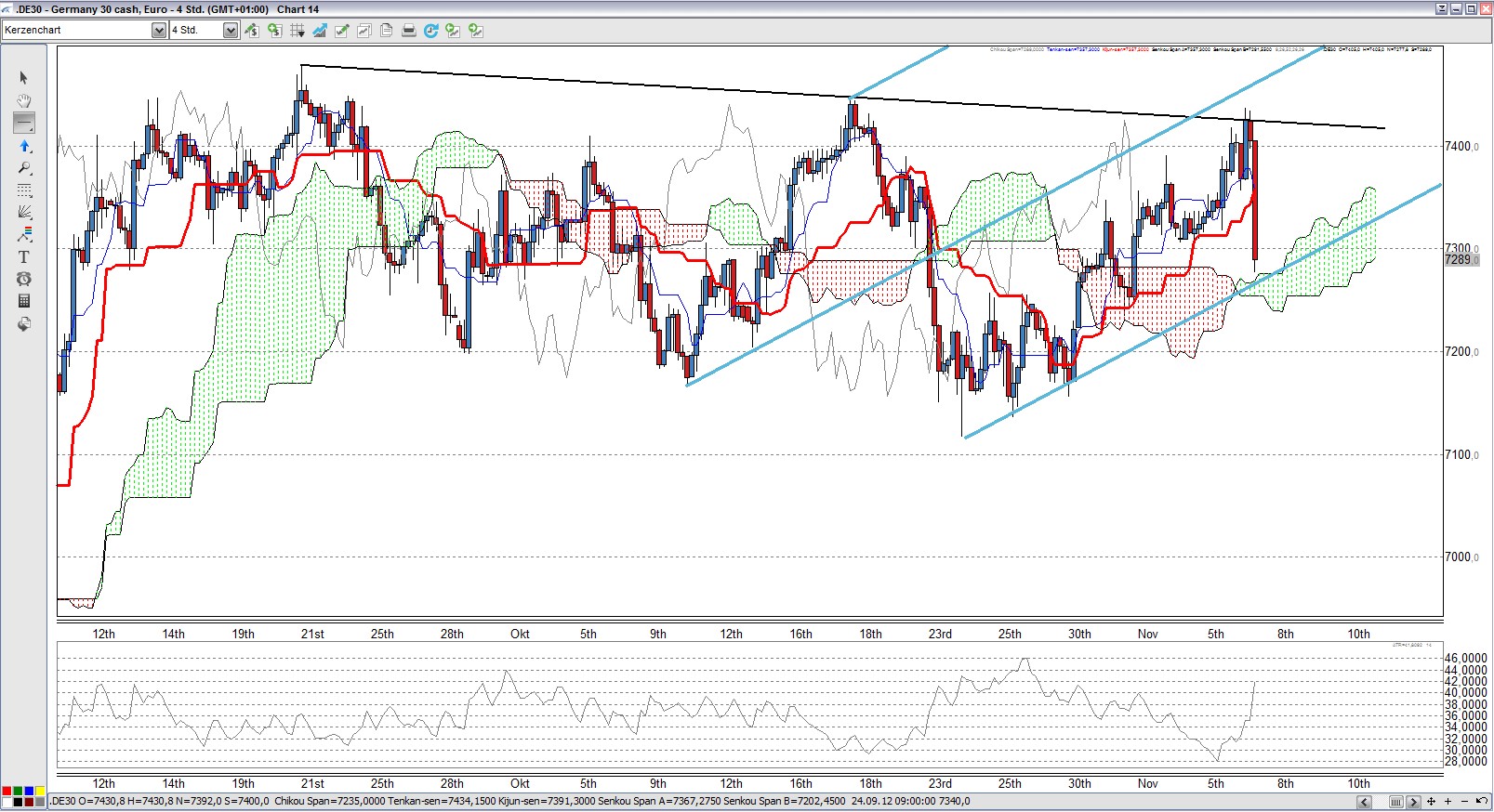 Hier ist schön zu sehen, dass sich der Kurs des Währungspaares EUR/USD immer noch im aufsteigenden AP befindet und fast punktgenau an der oberen AP Begrenzung abprallte. Solange der Kurs innerhalb des AP bleibt, ist der Aufwärtstrend intakt. Erstes Kursziel ist sicherlich die wichtige Marke von 1,30.
