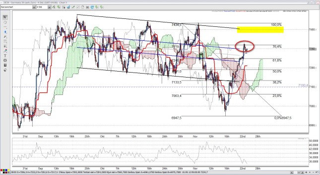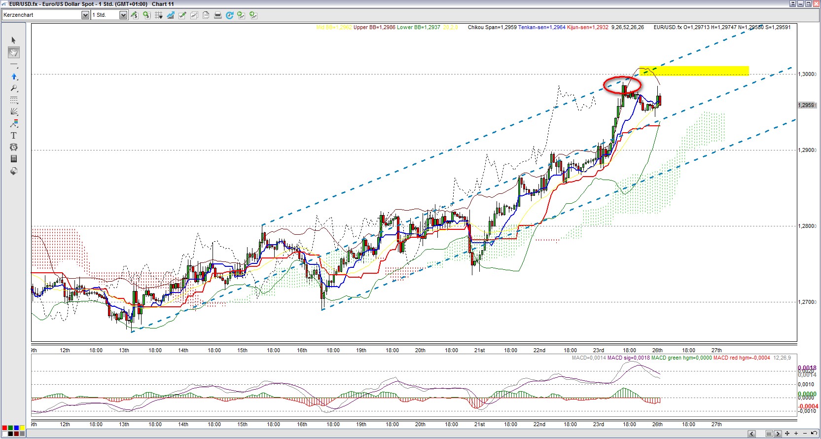 Hier ist schön zu sehen, dass sich der Kurs des Währungspaares EUR/USD immer noch im aufsteigenden AP befindet und fast punktgenau an der oberen AP Begrenzung abprallte. Solange der Kurs innerhalb des AP bleibt, ist der Aufwärtstrend intakt. Erstes Kursziel ist sicherlich die wichtige Marke von 1,30.