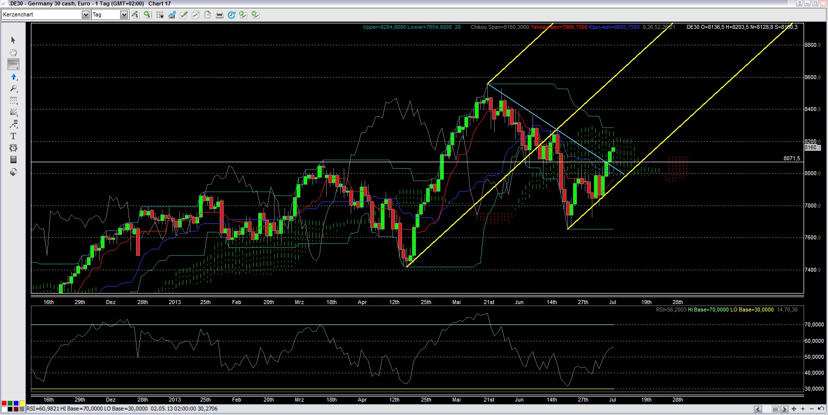 Nachdem das Währungspaar EUR/USD das Andrews Pitchfork, die gleitenden Durchschnitte und die Ichimoku-Wolke nach unten verlassen hatte, ging es steil bergab bis zum Unterstützungsbereich bei ca. 1,2750. Dort waren ebenfalls die Tiefs aus März und Mai. Genau von dieser Unterstützung konnte der Euro stark zulegen uns startete senkrecht mit einer enormen bullischen Tageskerze bis in den Bereich von 1,3130/13200 durch. Dort liegt das AP, die obere Begrenzung der Ichimoku Wolke und das wichtige 74,6%-Retracements. Aktuell befindet sich der Euro bei 1,3027 genau im Bereich der gleitenden Durchschnitte.