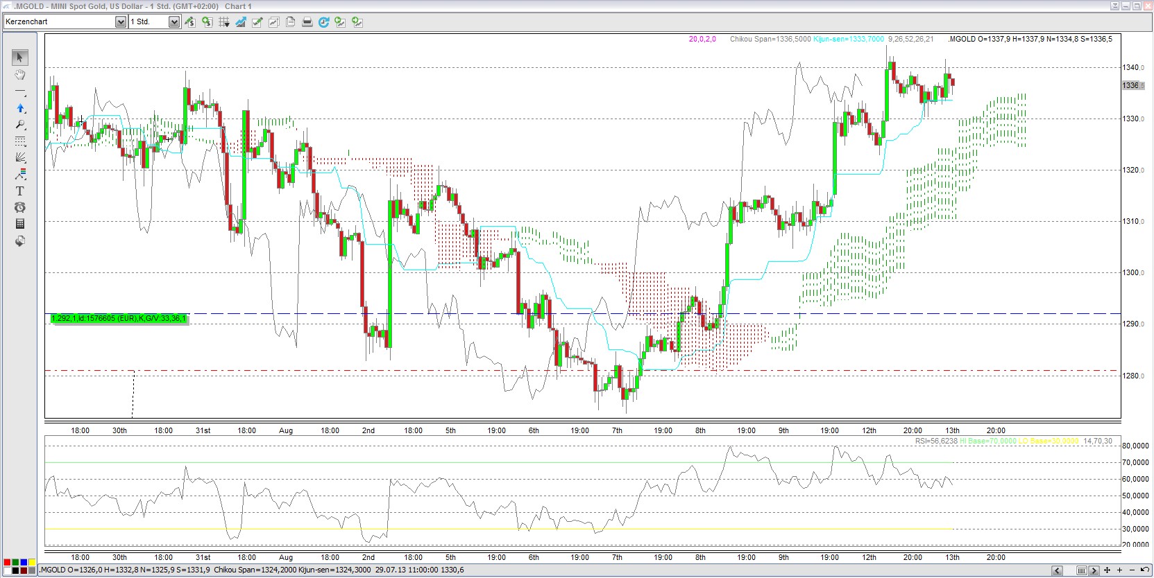 Einstieg wegen Kreuzen von Tenkan Sen und Kijun Sen! War etwas riskant, da das Kreuzen unterhalb der Wolke stattfand, also kein klares Longsignal, aber gutes CRV.