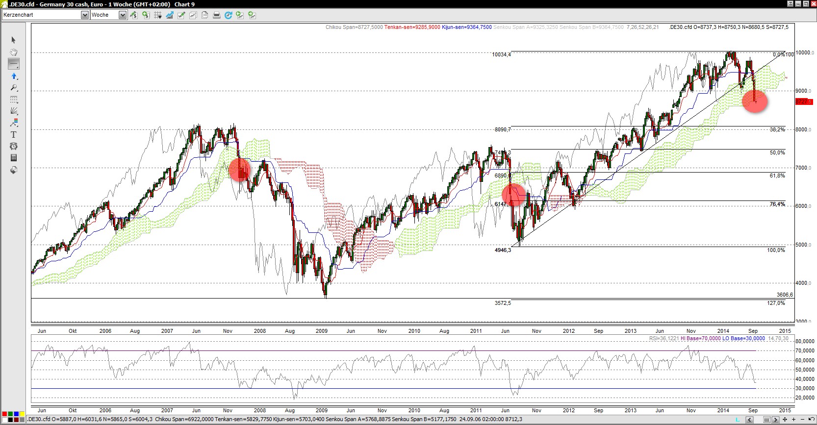 Diese Woche wird es sehr spannend. Es wird sich entscheiden, ob der DAX auf Wochenschlusskursbasis die Ichimokuwolke nach unten verlässt, oder ob es eine Rückkehr in die Wolke gibt. In der Vergangenheit gab es öfters nach diesem Shortsignal weitere starke Rückgänge. Mal abwarten…