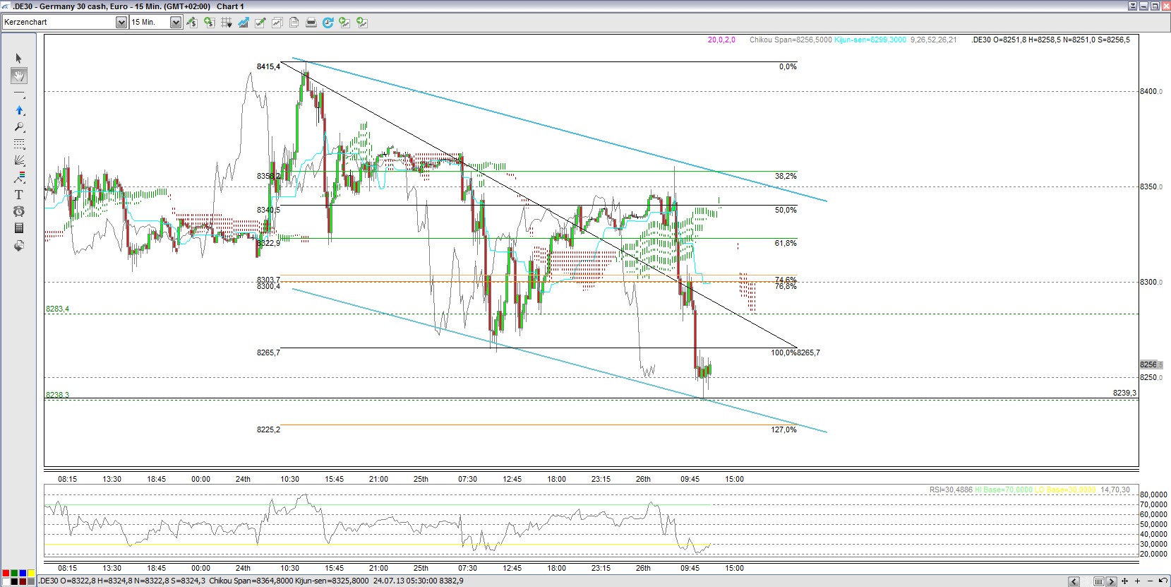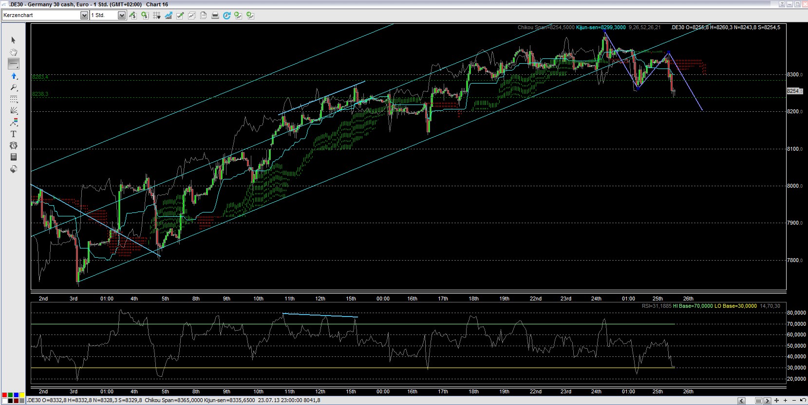 Mehrfach konnte der DAX an der unteren Linie des aufsteigenden Andrew´s Pitchfork nach oben abprallen (s. rote Kreise). Schliesslich allerdings ging es bergab mit dem Verlassen des AP und dem Verlassen der Ichimokuwolke nach unten. Allerdings ist nun beim unten abgebildeten RSI zu erkennen, dass der Bereich von < 30 errreicht wurde. Es könnte nun hier in dem Bereich von 8270 Punkten zu einer Konsolidierung kommen.