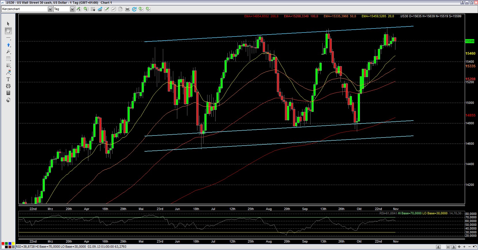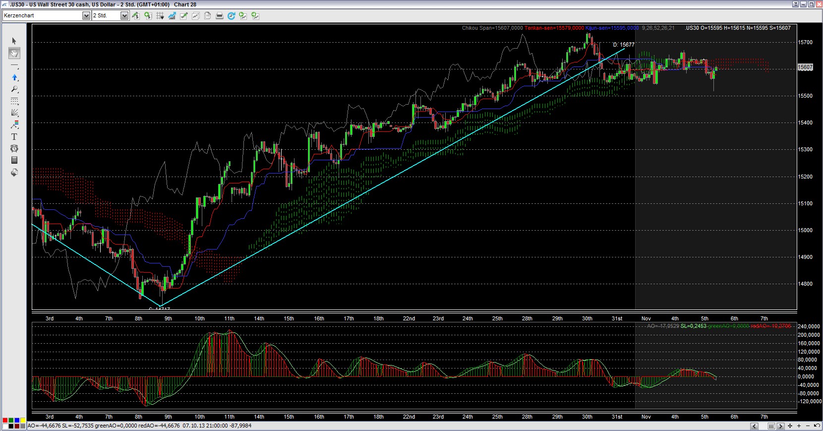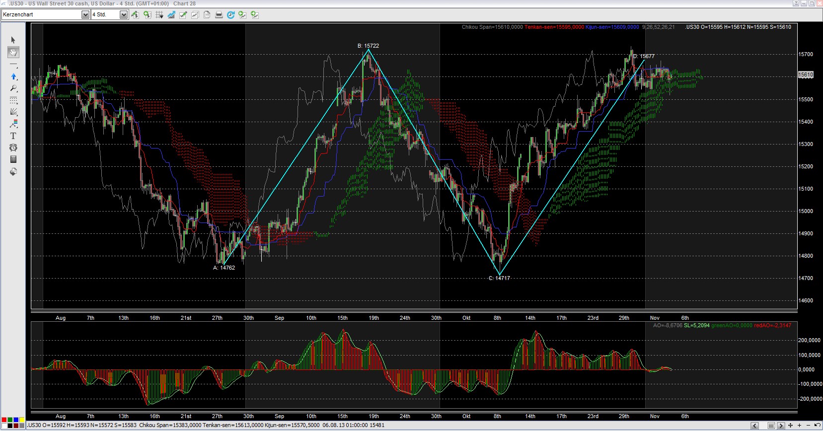 Der Dow Jones steht am oberen Ende des AP und könnte daher nach unten abprallen (hier 4h-Chart). Interessant ist der Vergleich zum Tageschart unten. Dort sind die obere Begrenzung der Ichimokuwolke (Senkou Span A), der obere Donchian Channel bei 15350 und Andrew´s Pitchfork fast alle auf einem Niveau. Dieser Bereich muß erstmal nachhaltig überwunden werden.