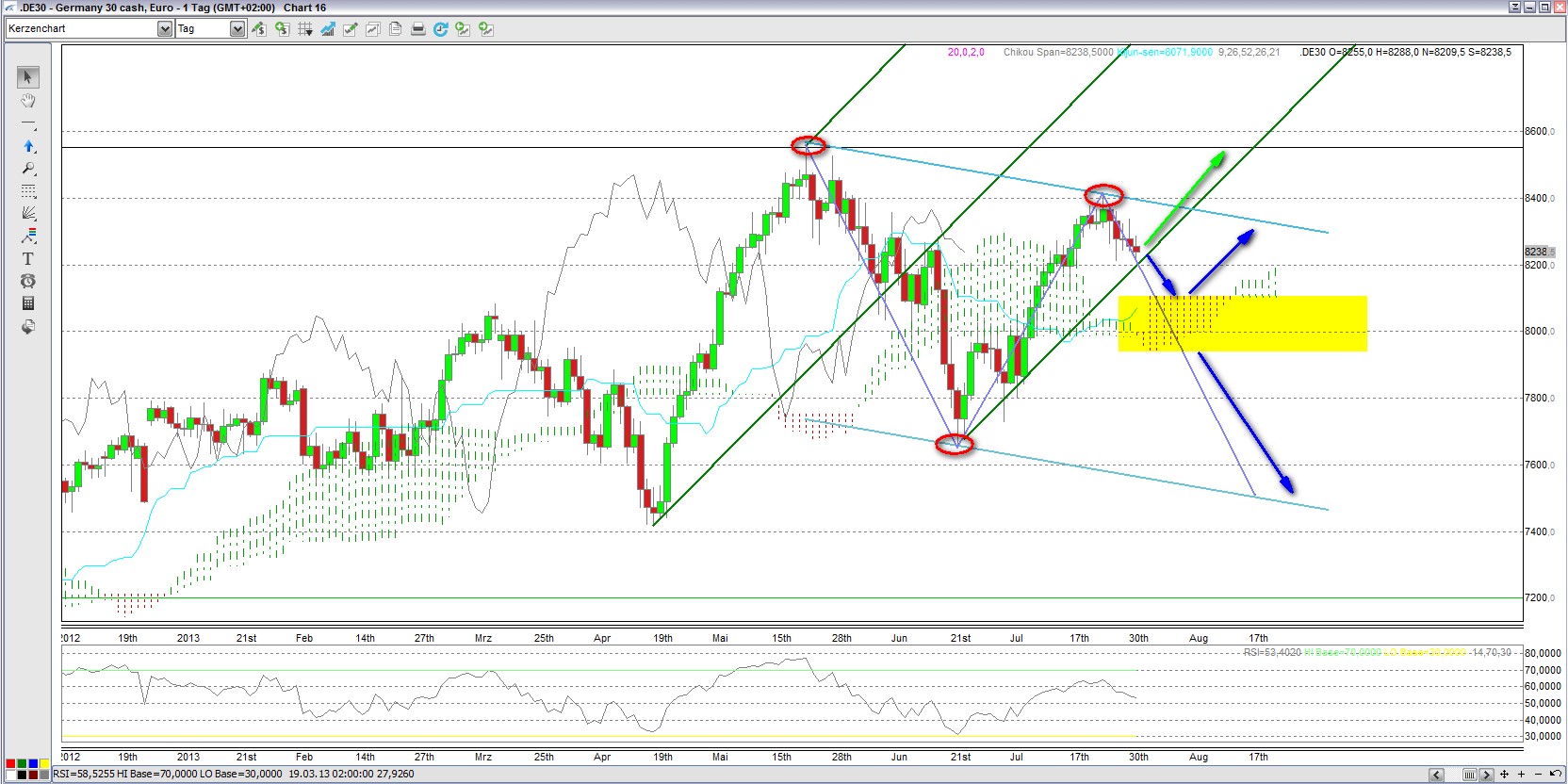 Noch besteht beim DAX die Möglichkeit, nach oben durchzustarten und das Allzeithoch im Bereich von 8500 zu erreichen. Der gelbe Bereich bietet hier eine mögliche Unterstützung. Es könnte natürlich auch bergab gehen, sobald Andrew´s Pitchfork nach unten verlassen wird / bzw. die Ichimoku Wolke nach unten durchstoßen wird. Kursziel wäre dann der Bereich um die 7500 Punkten.