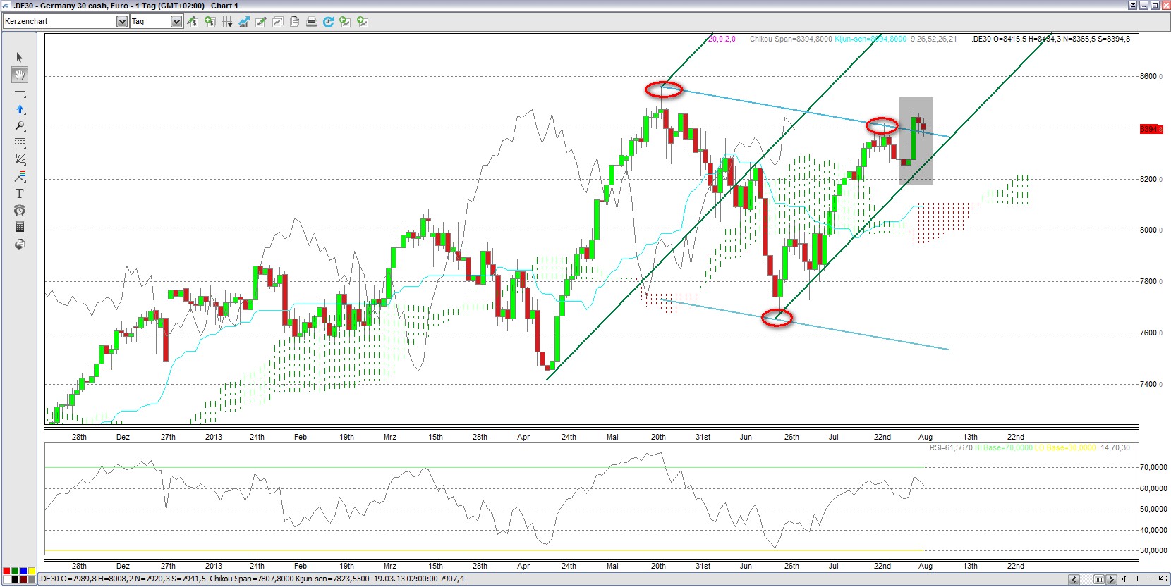 Es wird sehr spannend beim DAX. Mehrfach ist der DAX an der oberen blauen Abwärtstrendlinie nach unten abgeprallt (vgl. rote Kreise). Es könnte nun wieder abwärts gehen. Allerdings gab es heute eine starke Aufwärtsbewegung mit einem Ausbruch nach oben aus der IchimokuWolke heraus. Zudem wurde das fallende graue AP nach oben verlassen. Sollte der Widerstand bei 8420/8460 Punkten nachhaltig nach oben überwunden werden, besteht weiteres Aufwärtspotenzial.