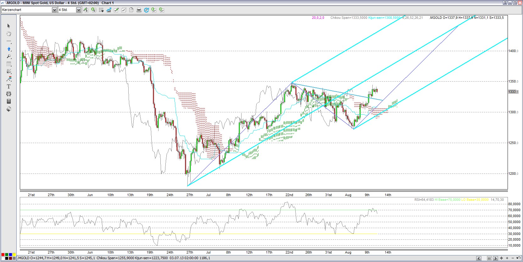 Auf Tagesbasis befindet sich der Goldpreis laut Ichimokuwolke nun im „neutralen“ Bereich. Der Abwärtstrend wurde noch nicht beendet. Allerdings könnte ein Ausbruch nach oben über den Bereich von 1340 USD weitere Kurszuwächse folgen lassen. Nächste Marken wären 1372, dann 1418 USD. Solange der Ausbruch allerdings nicht gelingt, könnte der Goldpreis weiter zwischen 1300 und 1340 USD schwanken.