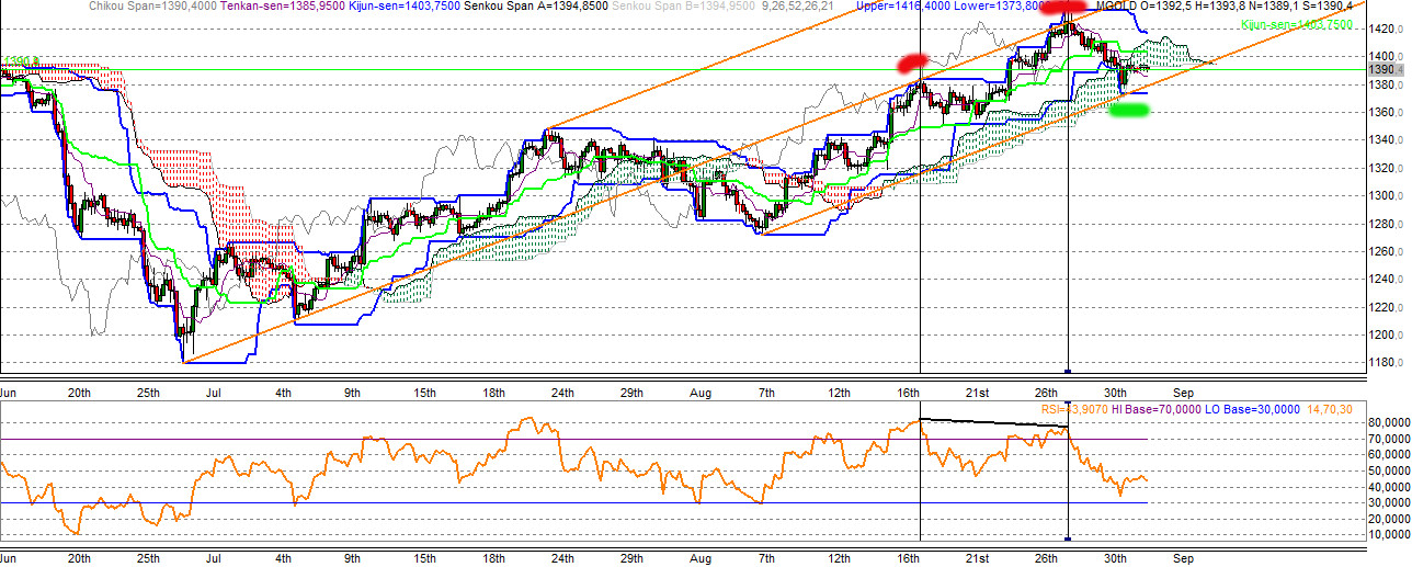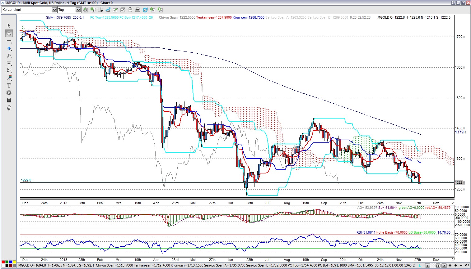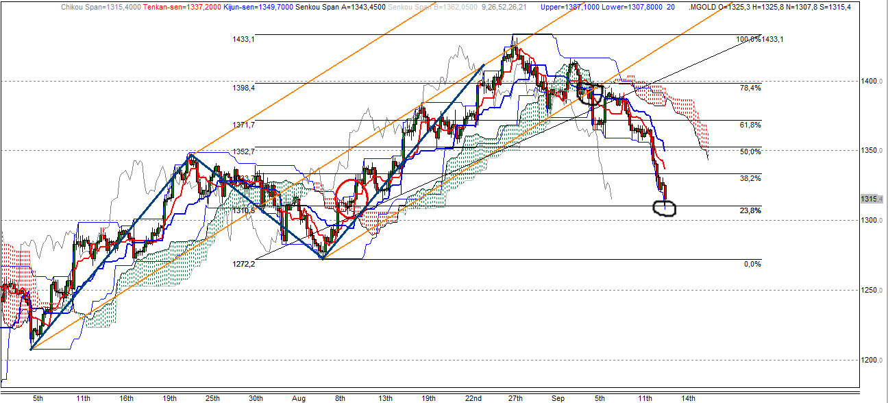 Hier ist gut zu erkennen, daß der Kurs genau bis zur mittleren Linie des AP gelaufen ist. Dort prallte er nach unten ab. Vgl. Divergenz bei den Hoch von 1380 und 1430 Punkten (höhere Hochs) und den niedrigeren Hochs beim RSI. Aktuell liegt der Goldpreis unterhalb der wichtigen Marke von 1400 USD bei 1390 USD. Nun muß man beobachten, ob das AP nach unten verlassen wird. Wir sehen gerade, dass die Ichimokuwolke nach unten verlassen wird. Dies ist ein erstes short Signal.