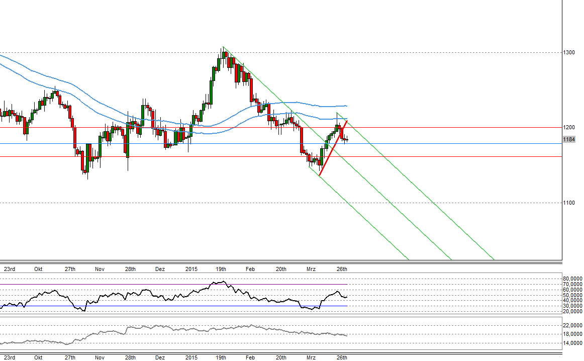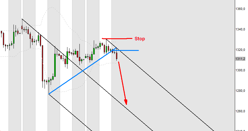 Aktuelles Kursziel der Aufwärtsbewegung liegt bei ca. 1350 USD. Allerdings sollte der Kurs nicht mehr unter die Marke von 1275 USD fallen. Die Trendwende startete vor einigen Tagen bei ca. 1200 USD, nachdem diese Marke kurzfristig unterschritten worden war.