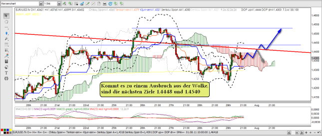 Das Währungspaar EUR/USD bricht heute nach unten aus der unteren Begrenzung des Andrew´s Pitchfork aus. Wichtig ist nun, ob sich dieses Shortsignal als nachhaltig erweist. Noch bietet die Ichimoku-Wolke im Bereich von 1,2968 – 1,3000 eine Unterstützung. Die gleitenden Durchschnitte 20,50,100 und 200 sind allerdings alle bereits unterschritten. Unterhalb von 1,2968 wäre dies ein klares Shortsignal. Aktuell warten wir noch ab.