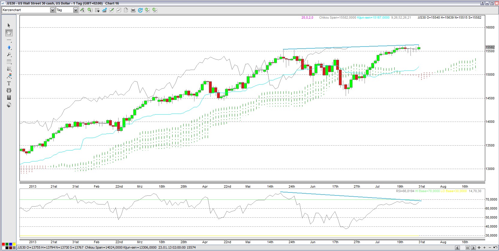Mögliches Shortsignal im Dow Jones, falls sich die Divergenz auf Schlusskursbasis bestätigen sollte. Allerdings kommen heute noch wichtige Entscheidungen, die den Kursverlauf stark beeinflussen können, wie der FED Zinsentscheid um 20 Uhr. Bedingung für das Shortsignal ist, dass der Kurs nicht mehr über das Hoch von 15640 Punkten steigt!