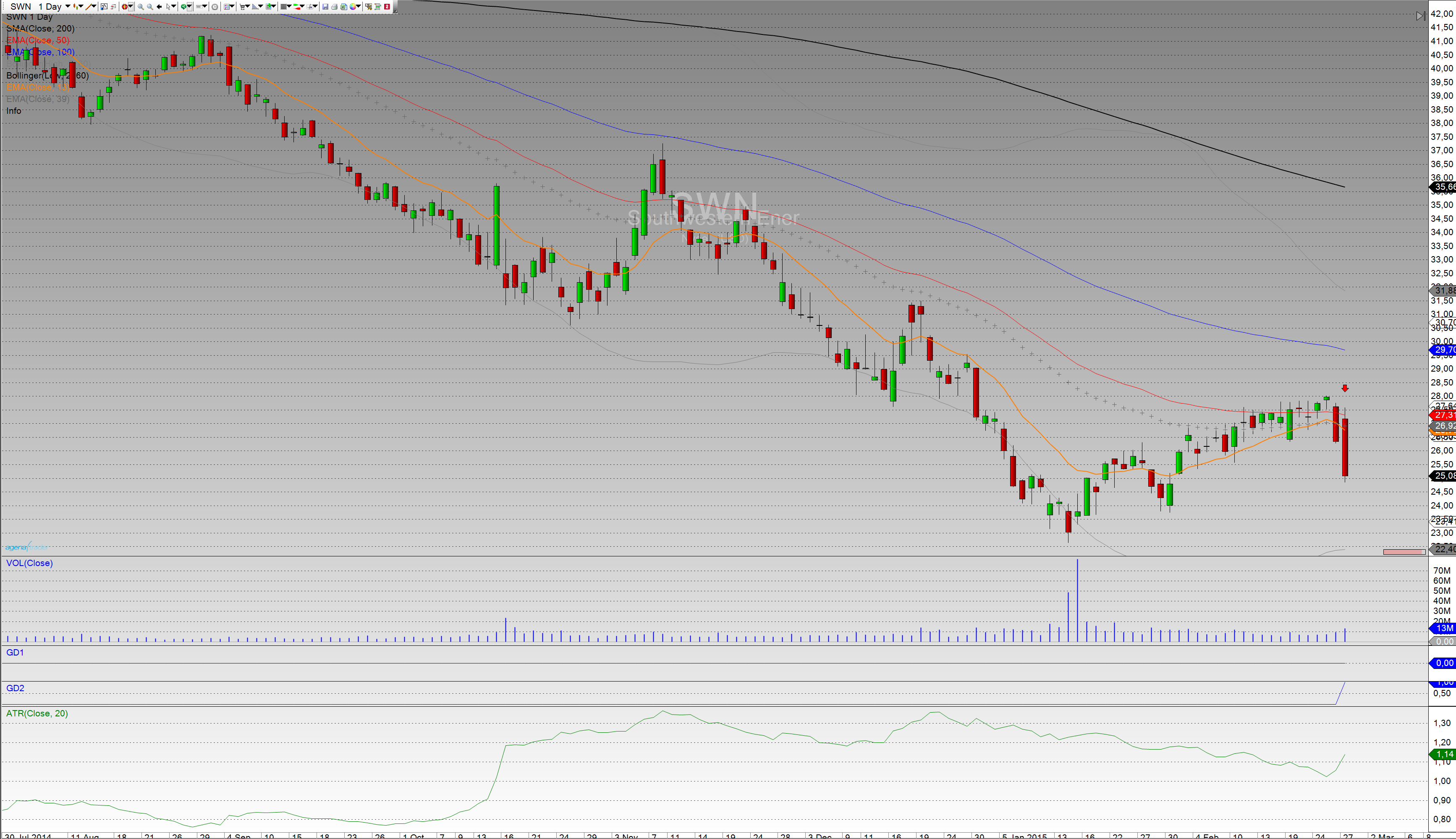 Heute ist eine sehr spannende Situation beim DAX zu beobachten. Momentan bricht der Kurs bei 10150 Punkten nach unten aus dem blauen steigenden Andrews Pitchfork nach unten aus. Zudem befindet sich der Kurs erstmalig seit dem 21.10.2015 wieder unterhalb der Ichimoku-Wolke. Es gibt noch eine Unterstützung bei 10120 Punkten. Hält diese Marke könnte es wieder aufwärts gehen. Ansonsten gibt nun das rote abwärts gerichtete AP den weiteren Trend vor.